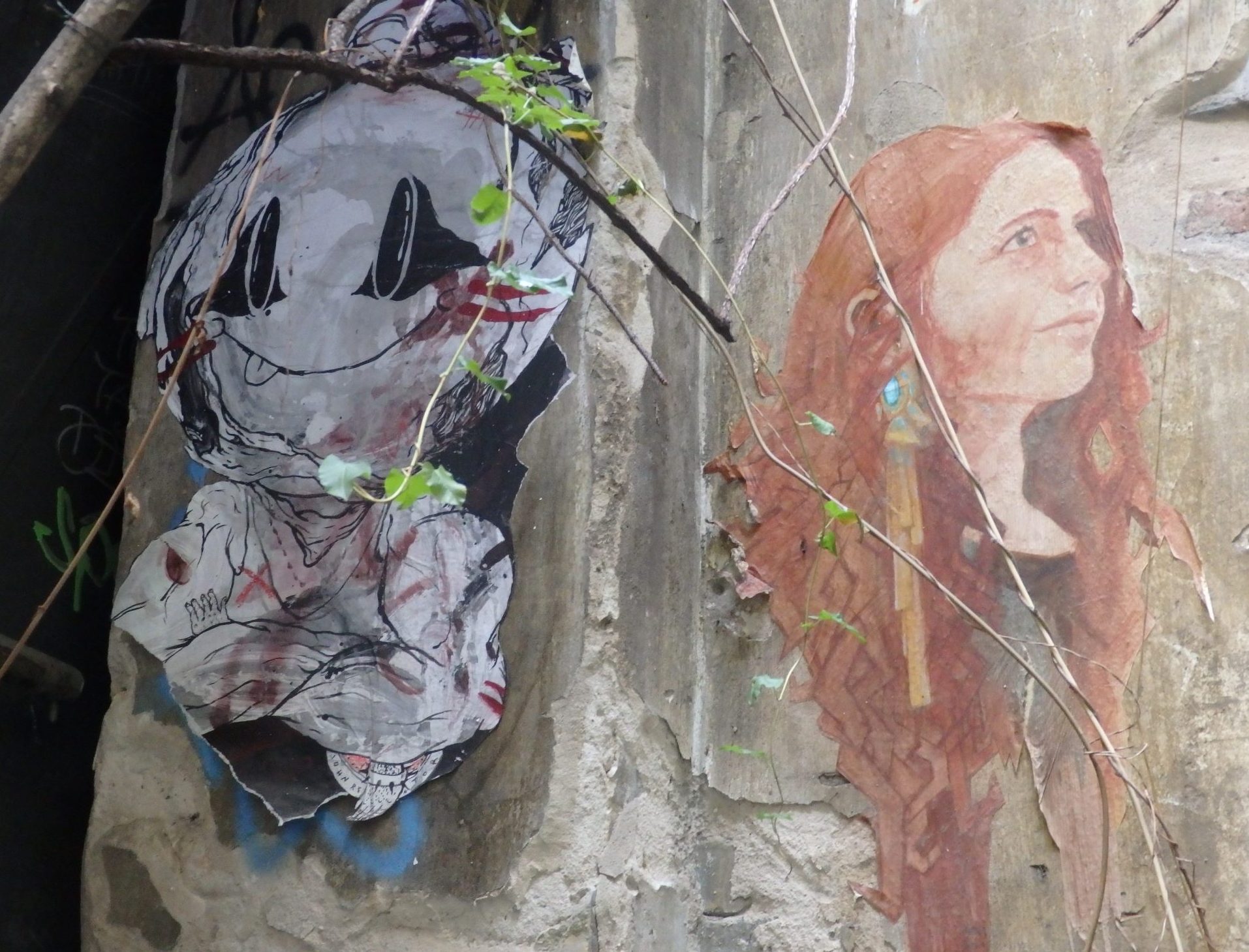 We started off nearby, walking a street along the raised railway tracks, where we could see details of various types of graffiti (or street art, depending on your point of view) close up. This was the kind of street I would normally hurry past: posters peeling from the walls, many pasted on top of older ones. I normally wouldn’t even look.
